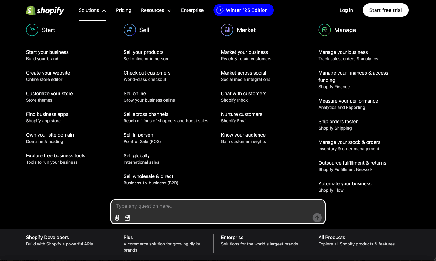 It would be hard to find a better landing page than Shopify, both in beauty and effectiveness. Again, I would copy as much as possible. What's fun about analyzing these design-focused companies is that you can find new features you hadn't seen before, like the interactive demos, quirky pages, like the Winter '25 Update page, and opportunities for improvement, such as the visual layout of the store dashboard page.
